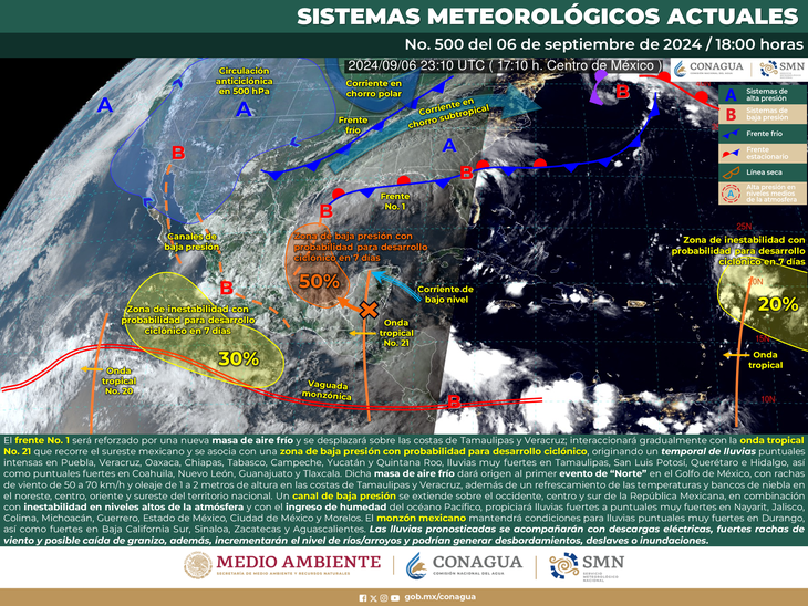 Además, se esperan lluvias muy fuertes en Tamaulipas, San Luis Potosí, Querétaro e Hidalgo, así como puntuales fuertes en Coahuila, Nuevo León, Guanajuato y Tlaxcala. En esta zona también imáctará el Frente Frío número 1, el cual dará origen al primer evento del Norte en el Golfo de México.