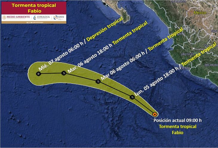 Fabio se formó al sur-suroeste de las costas de Colima y Jalisco, pero la trayectoria prevista es sobre las aguas del océano y sin intensificarse a huracán. Su circulación ocasionará lluvias fuertes a puntuales muy fuertes en Guerrero, Michoacán, Colima y Jalisco, así como viento con rachas de 50 a 70 km/h, oleaje de 2 a 3 metros de altura y posible formación de trombas marinas en costas de los estados mencionados.