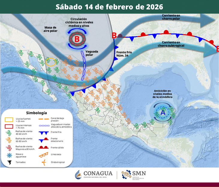 El Servicio Meteorológico Nacional (SMN) emitió su reporte diario para México este sábado 14 de febrero de 2026, donde se celebra un nuevo Día de San Valentín. Si bien la buena noticia es que casi no habrá lluvias, el Frente Frío número 34 generará fuertes vientos en al menos nueve estados y los ciudadanos deberán tomar las precauciones necesarias.