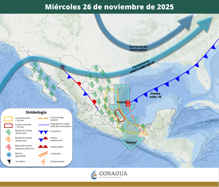 El Servicio Meteorológico Nacional (SMN) dio a conocer el pronóstico del tiempo en México para la última semana de noviembre 2025, en el cual advirtió por lluvias de hasta 150 mm en al menos tres estados a partir del miércoles 26. El culpable de este fenómeno será el Frente Frío número 16, el cual también hará descender las temperaturas en varias zonas del país.