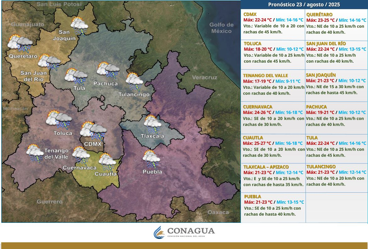 Condiciones de cielo nublado la mayor parte del día. Durante la mañana, se prevé ambiente fresco en la región y frío con bancos de niebla en partes altas. Por la tarde, ambiente templado a cálido, con probabilidad de lluvias puntuales fuertes (25 a 50 mm en 24 h) en la Ciudad de México y puntuales muy fuertes (50 a 75 mm en 24 h) en el Estado de México. Dichas lluvias se acompañarán con descargas eléctricas y posible caída de granizo.