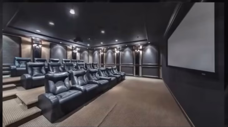 En el interior destacan los candiles de cristal, pisos y muros de mármol, además de una recámara principal de 150 metros cuadrados. El garaje puede albergar hasta siete automóviles, y la cocina está equipada con una isla central de diseño italiano.