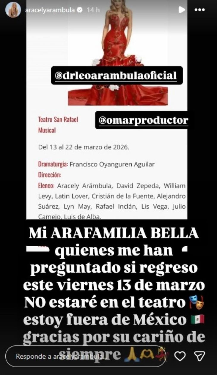 En su primera publicación, Arámbula confirmó que pondrá pausa a sus compromisos laborales en el país y agradeció el cobijo de sus fans: "Este viernes 13 de marzo NO estaré en el teatro, estoy fuera de México, gracias por su cariño siempre", escribió, acompañando el texto con una fotografía personal.