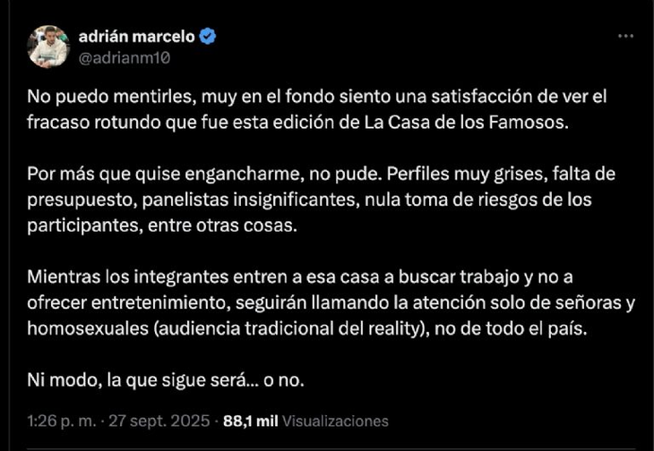 Se trata de Adrián Marcelo, que expresó que muchos concursantes siguen “llamando la atención solo de señoras”, sugiriendo que su contenido apelaría a audiencias específicas más que a un público general.