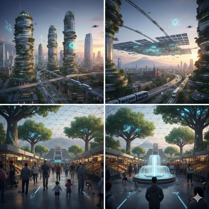 De acuerdo con proyecciones generadas por Inteligencia Artificial, la Ciudad de México en 2100 podría experimentar una transformación marcada por la sostenibilidad y la tecnología. Uno de los cambios más relevantes sería la consolidación de edificios inteligentes y autosuficientes, capaces de generar su propia energía mediante paneles solares avanzados y sistemas de captación de agua pluvial optimizados.