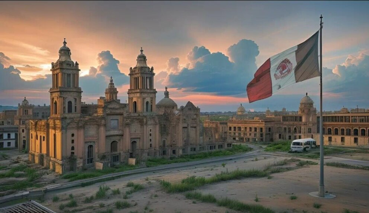 En las imágenes generadas por IA, la CDMX aparece como un escenario desolado, cubierto de musgo, maleza y estructuras deterioradas. La Plaza de la Constitución, comúnmente repleta de vida, ceremonias y turistas, luce completamente vacía. El piso de la explanada está quebrado, la vegetación emerge entre las grietas y los edificios que rodean el Zócalo presentan tonos apagados por el tiempo. Según @nostalgiatime1999, este sería el aspecto del corazón de la ciudad tras décadas sin mantenimiento ni presencia humana.