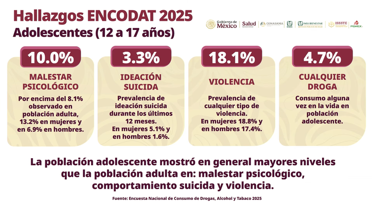 La urgencia de implementar el "ABC de las emociones" se sustenta en los crudos resultados de la reciente Encuesta Nacional de Consumo de Drogas, Alcohol y Tabaco (ENCODAT) 2025. Los datos oficiales presentados por las autoridades demuestran que la población adolescente ya supera a los adultos en niveles de malestar psicológico, comportamiento suicida y exposición a la violencia: