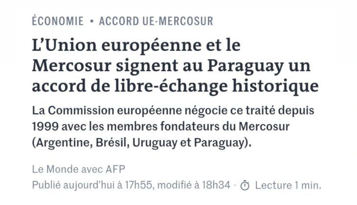 Desde Le Monde (Francia, otro país que presentó limitaciones al momento de terminar de acordar) tituló un artículo que decía: "La UE y el Mercosur firmaron en Paraguay un acuerdo de libre comercio histórico".