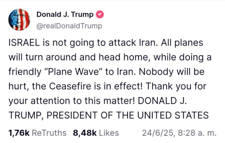 Previamente a ratificar el alto en fuego, Trump pidió a Israel que no lanzara bombas ya que "si lo hacen, será una violación grave. ¡Traigan a sus pilotos a casa ya! Donald J. Trump, presidente de los EEUU", fue le mensaje completo del mandatario en su red social Truth Social.