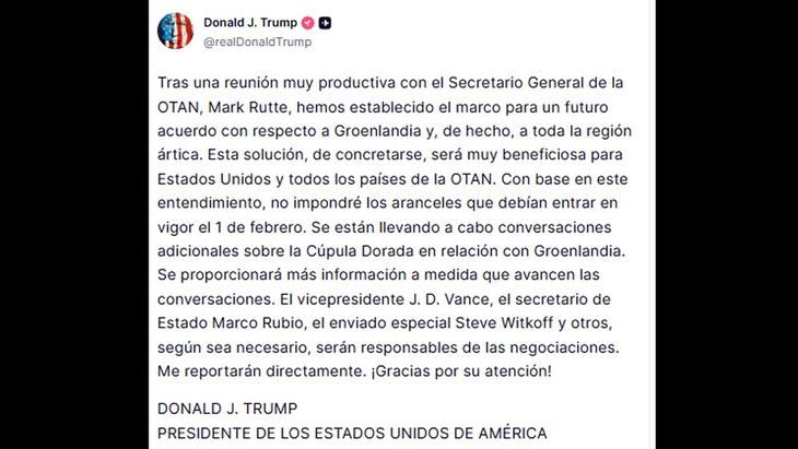 "Tras una reunión muy productiva con el Secretario General de la OTAN, Mark Rutte, hemos establecido el marco para un futuro acuerdo con respecto a Groenlandia y, de hecho, a toda la región ártica", afirmó en su cuenta de Truth Social, donde dejó en claro que es un primer paso, pero no el definitivo: "Esta solución, de concretarse, será muy beneficiosa para Estados Unidos y todos los países de la OTAN".