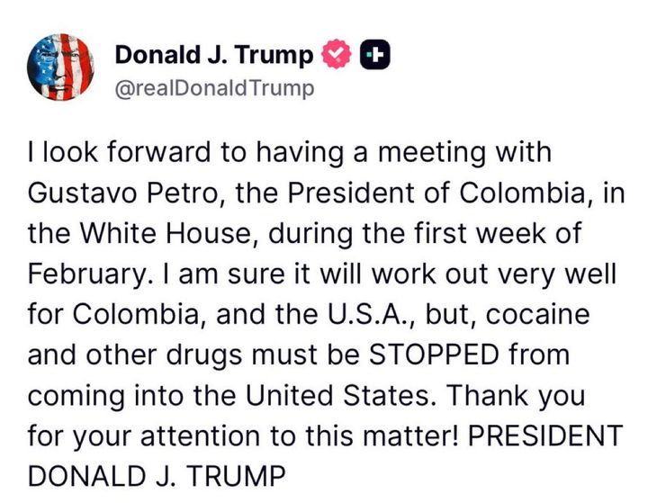 "Espero con interés reunirme con Gustavo Petro, presidente de Colombia, en la Casa Blanca durante la primera semana de febrero. Estoy seguro de que será muy beneficioso para Colombia y Estados Unidos", escribió el mandatario.