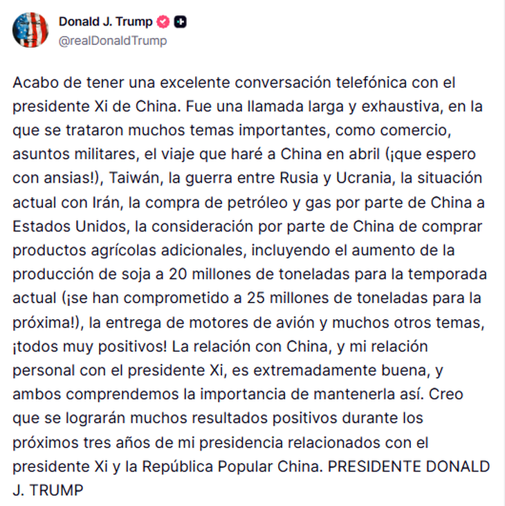 "Fue una llamada larga y exhaustiva, en la que se trataron muchos temas importantes, como comercio, asuntos militares, el viaje que haré a China en abril (¡que espero con ansias!), Taiwán, la guerra entre Rusia y Ucrania, la situación actual con Irán, la compra de petróleo y gas por parte de China a Estados Unidos, la consideración por parte de China de comprar productos agrícolas adicionales", detalló Trump sobre el temario.