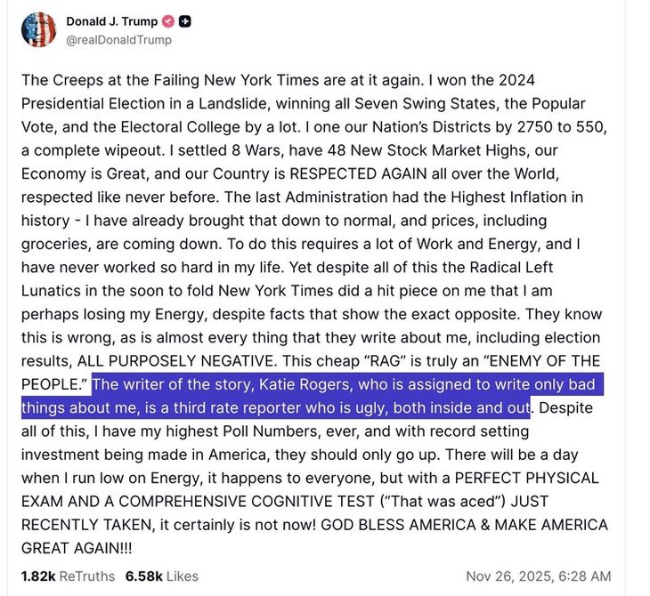 El presidente de Estados Unidos, Donald Trump, volvió a quedar envuelto en una fuerte controversia tras insultar en Truth Social a la reportera Katie Rogers, de The New York Times, a quien definió como “fea por dentro y por fuera”. Es la tercera vez en semanas que el mandatario ataca a mujeres periodistas por su apariencia o desempeño, profundizando la tensión con los medios.