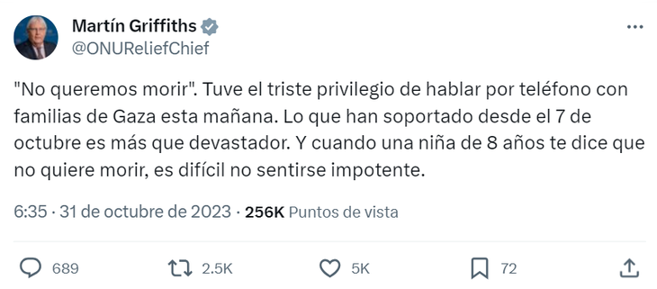Antes de abordar con autoridades israelíes y palestinas el estado de situación ante la actual escalada, Griffiths contó que tuvo la oportunidad de hablar por teléfono con algunas de las familias de Gaza afectadas por los ataques de Israel. "He tenido el triste privilegio de hablar con varias familias de Gaza por teléfono. Lo que han tenido que soportar desde el 7 de octubre va más allá de lo devastador", tuiteó en su cuenta de la red social X (antes Twitter).