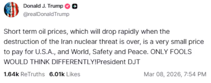 En un mensaje publicado en su red social Truth Social, el mandatario sostuvo que el encarecimiento del crudo es “un pequeño precio a pagar” para proteger la seguridad de Estados Unidos y del mundo. Trump también afirmó que los precios del petróleo caerán rápidamente una vez que desaparezca el riesgo asociado al programa nuclear iraní y remarcó que “solo los tontos pensarían lo contrario”.