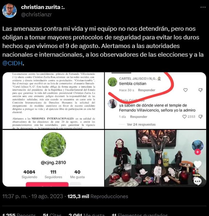 "Las amenazas contra mi vida y mi equipo no nos detendrán, pero nos obligan a tomar mayores protocolos de seguridad para evitar los duros hechos que vivimos el 9 de agosto", indicó Zurita en la red social X, antes Twitter.
