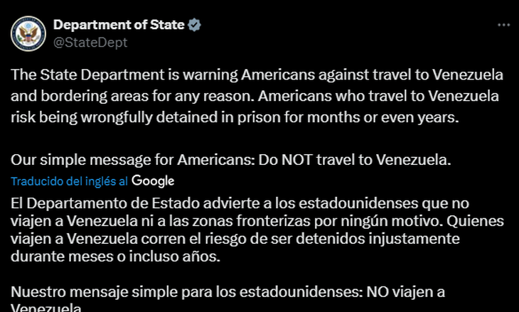 Desde la gestión republicana asignaron a Venezuela el nivel más alto de alerta de viaje, el 4, "debido a graves riesgos, como detención injusta, tortura durante la detención, terrorismo, secuestro, prácticas policiales injustas, delitos violentos, disturbios civiles y atención médica inadecuada".