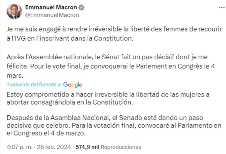 "Estoy comprometido a hacer irreversible la libertad de las mujeres a abortar consagrándola en la Constitución. Después de la Asamblea Nacional, el Senado está dando un paso decisivo que celebro. Para la votación final, convocaré al Parlamento en el Congreso el 4 de marzo", expresó Macron en su cuenta de X (antes Twitter).