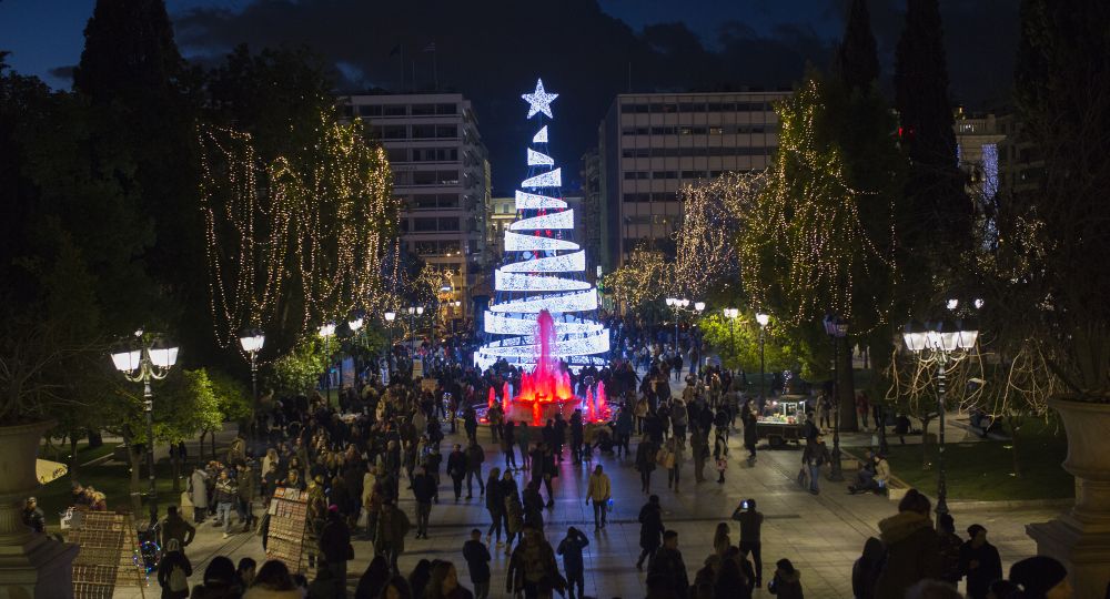 Otro extravagante árbol de Navidad iluminado en la plaza Syntagma de Atenas, Grecia.