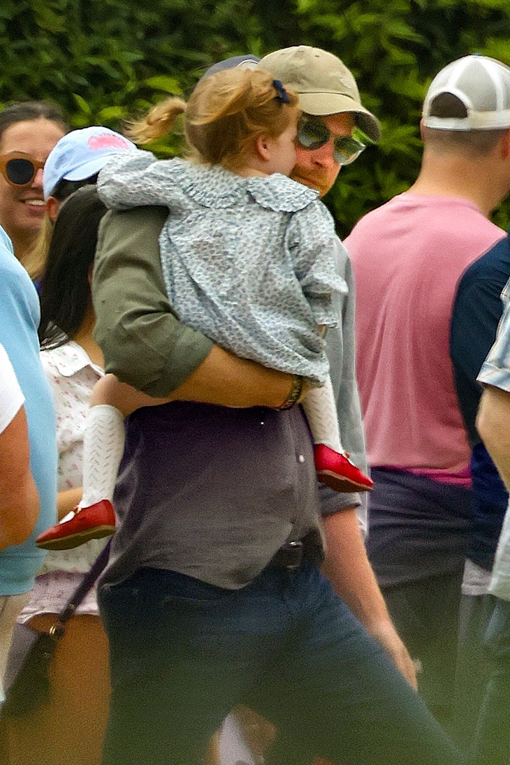 Harry se mostró con una camisa de lino, jeans, gorra al tono y gafas de sol, mientras que Lilibet –que heredó el pelo rojizo de su padre– lució un vestido de manga larga estampado, medias caladas y guillerminas rojas. Lili, como la llama su familia, llevó además dos colitas y una pequeña hebilla en forma de moño.