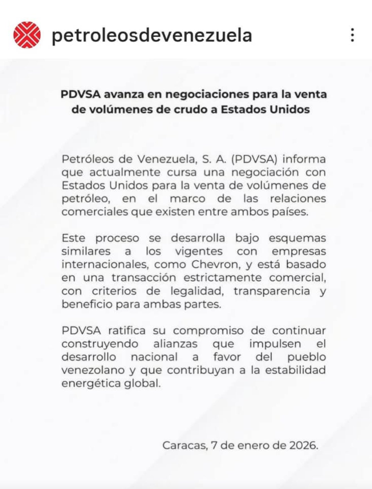 La estatal venezolana PDVSA anunció en un comunicado que está en tratativas con Chevron para comerciar barriles de crudo. El comunicado llega días después de la captura de Nicolás Maduro.