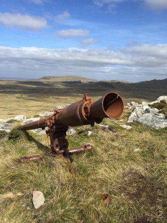 “Era como tirarle a una mosca con una bandita elástica”, el excombatiente mira el cañón ya oxidado. Le tira un poco de agua y espera que se seque. Al rato, se lee débil en el hierro: industria argentina. Es uno de los cañones que sigue clavado en Monte Longdon, el escenario de la batalla más cruda de 1982, dos días antes de la rendición final.