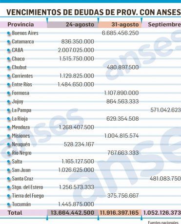 Mientras más de la mitad de las provincias busca reperfilar sus deudas bajo jurisdicción internacional con el envión del acuerdo que logró Nación con sus bonistas, ahora asoma en el horizonte inmediato otro frente para los gobernadores, que en agosto deberán afrontar vencimientos por $25.500 millones del Fondo de Garantía de Sustentabilidad (FGS) de la Anses. En septiembre se agregan un remanente de $1.000 millones adicionales.