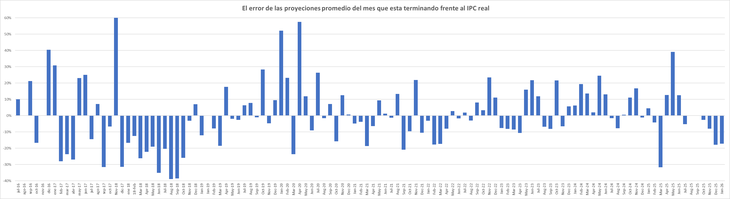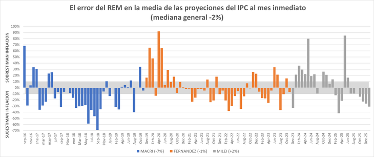 Los datos del REM son alarmantemente malos. Desde 2016 el 71% de las estimaciones sobre el incremento de los precios minoristas para el mes que sigue le erraron en más del 10% y 50% por más del 20%. Para el mes corriente el 54% le erraron por más de un 10% y el 28% en más del 20%.