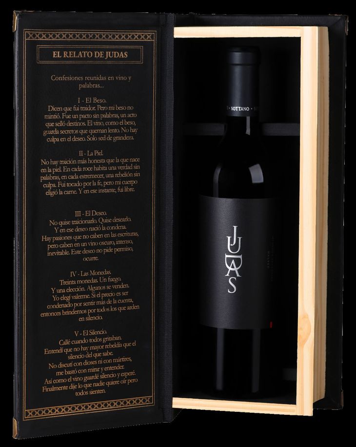 El vino Judas, de bodega Sottano, incluye en cada caja individual un relato bautizado "Confesiones reunidas en vino y palabras", en las que Judas hace un descargo por haber cedido a la traición.