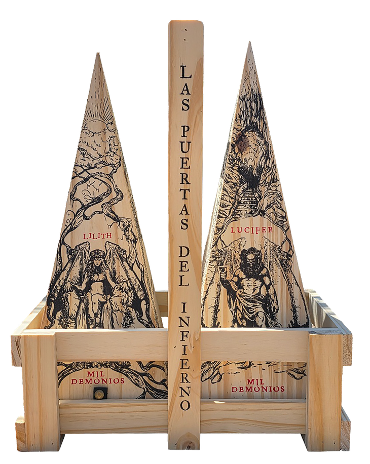 Otra expresión de su arte está plasmada en su línea de vinos Mil demonios, en sus variantes Lilith y Lucifer, donde cada botella se presenta dentro de un armazon de madera con forma de pirámide. Y en la caja contenedora resalta la frase "Las puertas del infierno".