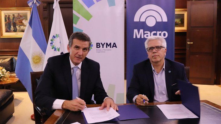 El presidente de BYMA, Ernesto Allaria, y el gerente general de Banco Macro, Gustavo Manríquez, sellaron la incorporación de la entidad bancaria al panel de “Gobierno Corporativo”.