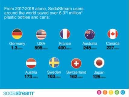 Según un estudio mundial de la marca SodaStream, entre 2017 y 2018 se lograron reducir 6,3 millones de botellas de plástico entre los países que más consumen el producto: Alemania, Estados Unidos y Francia, en los primeros lugares. La empresa, con sede central en Israel, fabrica sus productos con plástico reutilizable sin BPA. Tanto las botellas como la máquina de hacer soda están fabricadas con este tipo de materia prima.