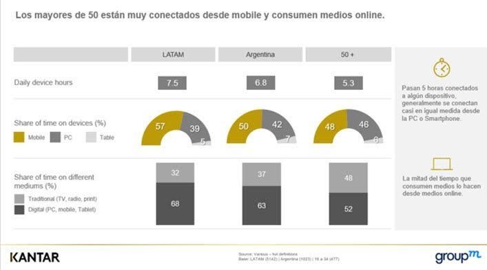 Por otro lado, son muy fáciles de alcanzar ya que tienen un bajo uso de AdBlockers, sólo un 12% de ellos lo tiene instalado contra un 27% en la población general. Su consumo de medios es muy similar al de los más jóvenes. Pasan en promedio 5 horas diarias conectados a un dispositivo ya sea móvil o desktop casi en igual medida. Les gusta la tecnología, poseen más PC que el resto de las audiencias, y especialmente utilizan más wearables (smartwatch y tablet). No son tan multitasking como los más chicos. Si bien consumen más contenidos audiovisuales desde la TV tradicional, un 80% mira habitualmente videos online. Y aunque tienen un uso del medio online más básico, más del 80% se conecta para chequear e-mails, ingresar a redes sociales y leer artículos online. Por otro lado, 3 de cada 5 personas de más de 50 años resuelve sus operaciones financieras vía homebanking.