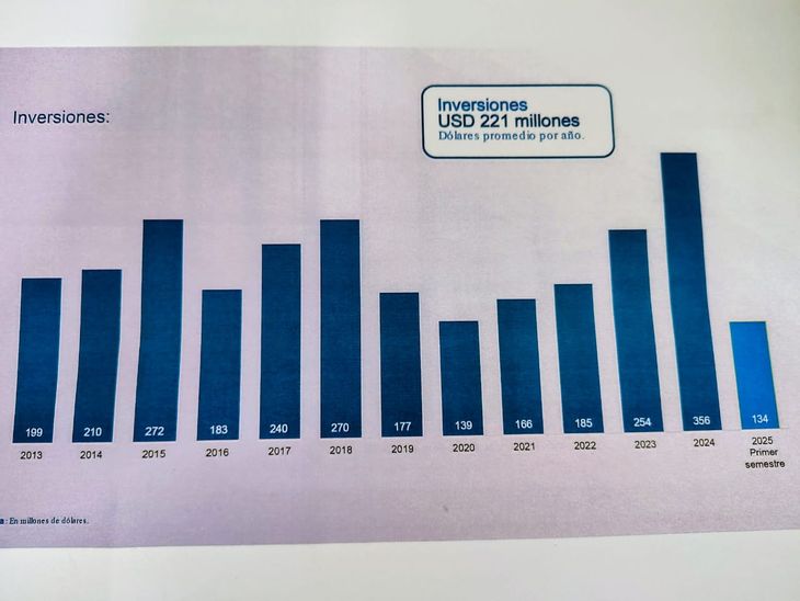 Según un informe de la empresa, el promedio de inversiones anuales es de u$s221 millones. Y en el primer semestre de este año ya lleva invertidos u$s134 millones. Hasta ahora, el pico de inversión se logró en 2024 con u$s356 millones.