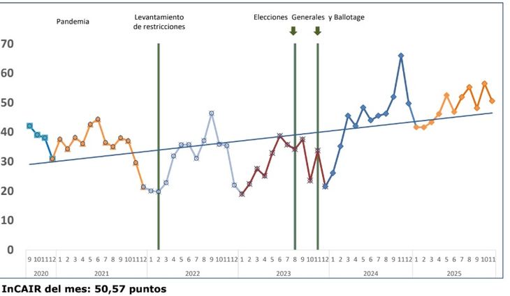 El índice de actividad (InCAIR) de noviembre último 5 se mantuvo en el orden de los 50,57 puntos, continuando con una tendencia sin grandes variaciones desde marzo de este año, pese a los anuncios vinculados al agro y las retenciones ocurridas a lo largo del 2025. Desde el cambio de gestión de Javier Milei, el pico de actividad inmobiliaria rural se obtuvo en noviembre del 2024, cuando se acercó a los 70 puntos, luego de un radical ascenso con respecto a diciembre del 2023, cuando la actividad se encontraba en torno a los 20 puntos, incluso por debajo de los niveles de las medidas de aislamiento por la pandemia.