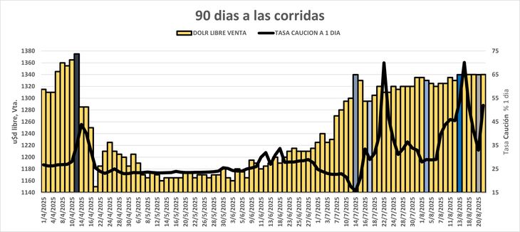 El 13 de agosto hubo otra renovación, en la que el gobierno logró un “rollover” (la relación entre lo que vence y lo que se renovó) del 61,07%, llevando que la tasa de caución trepara el jueves al 60-71.6%, tras tocar 90%.