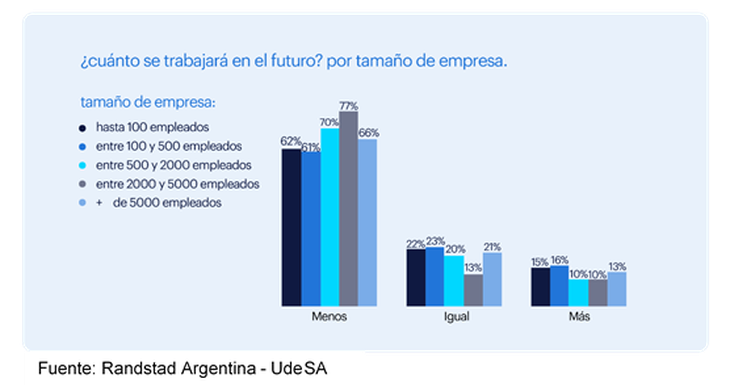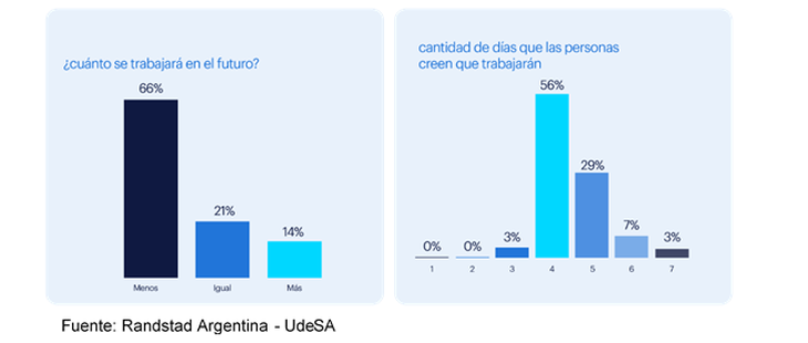 Al respecto, la consultora Randstad presentó los resultados del estudio realizado en conjunto con Universidad de San Andrés (UdeSA) a partir de una encuesta realizada a cerca de 700 personas, sobre cómo los argentinos perciben hoy el Futuro del Trabajo de aquí a 20 años. El informe revela que para el 66% de los encuestados en el futuro se trabajarán menos horas, en tanto que el 21% prevé que se trabajará igual que ahora y solo un 14% se inclina por pensar que en el futuro se trabajará más que ahora.