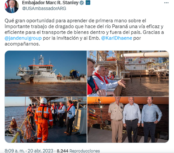 "Honrado de visitar, junto con mi colega @USAmbassadorARG, Marc Stanley, una draga de @Jandenulgroup en Corrientes. Me impresionó el trabajo de calidad que la compañía belga está haciendo desde hace varias décadas en la Argentina y la región. #Hidrovia", posteó Dhaene.