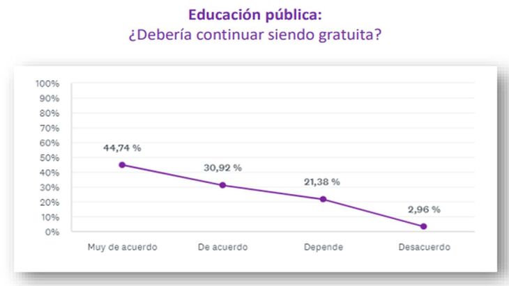 En materia de educación, los resultados de la encuesta arrojaron un rechazo a las ideas de eliminar la educación pública: el 75% consideró que debe continuar siendo gratuita y solo el 3% estuvo en desacuerdo respecto a la gratuidad. El 20% manifestó dudas al respecto.