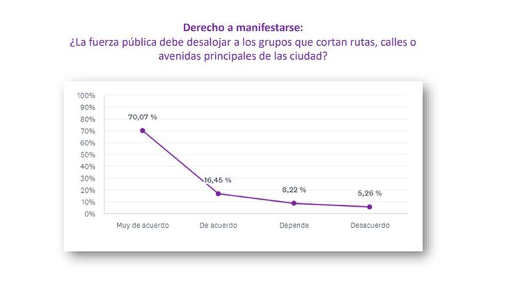 Por último, consultados sobre qué debiera hacer la Policía frente a contextos de cortes de calles y rutas, más del 86% estuvo a favor de que la fuerza pública desaloje a los manifestantes.
