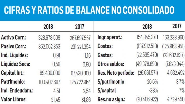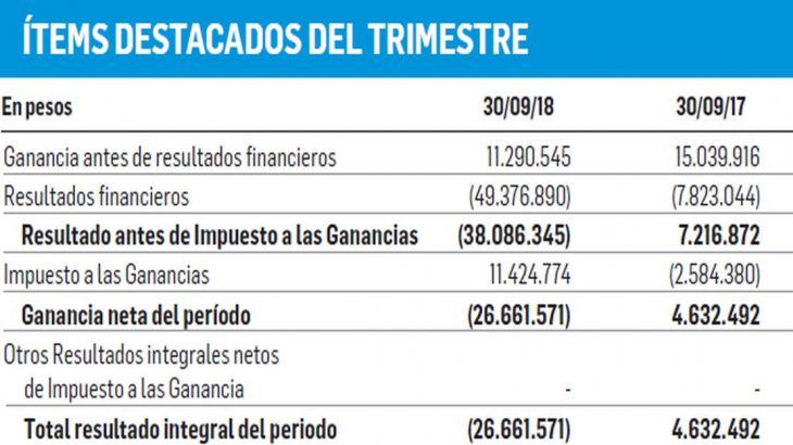 Descontados gastos, queda con un operativo de $11 millones, 25 por ciento menos (y en u$s un mínimo desde 2015 -acá habría alguna mejora de mediano/largo plazo) que con la disparada (+531 por ciento -la devaluación le llevó $39 millones) de la carga financiera a $49 millones (en u$s la mayor desde al menos 1998) y tras la mordida del fisco le significa un neto en contra de $26.661.571 (un año atrás ganaba $4,6 millones) en u$s el peor desde 2001.