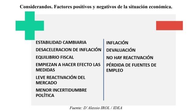 Asimismo, atribuyeron los problemas de la economía nacional al déficit fiscal, la falta de acuerdo entre distintas fuerzas políticas y la confianza. Por último, recomendaron al Gobierno informar "con claridad" las medidas que tome, contener la inflación y concentrarse en la estabilidad económica.