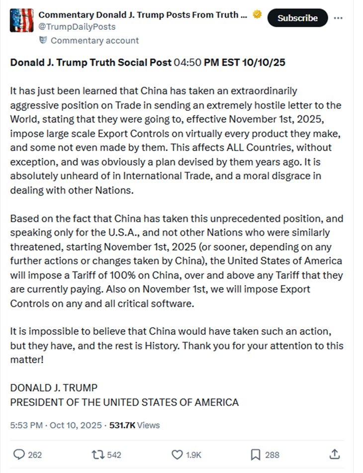 La cosa es que el viernes pasado Trump, quien estaba exultante por el acuerdo de paz entre Israel y Hamas, “ardió” cuando conoció la noticia. Fiel a su papel de “loco”, amenazó con imponer a partir del 1ro de noviembre, una tarifa del 100% a las importaciones chinas, además de aplicar nuevos controles a las exportaciones de “cualquier y todo en software crítico” que proviniese de aquel país y comenzó a deslizar que tal vez no se reuniría con Xi: “esta fue una verdadera sorpresa, no solo para mí, sino para todos los Lideres del mundo libre. Estaba por encontrarme con el presidente Xi en dos semanas, en la APEC en Corea del Sur, pero ahora parece que no hay ninguna razón para hacerlo” escribió en Truth Social.