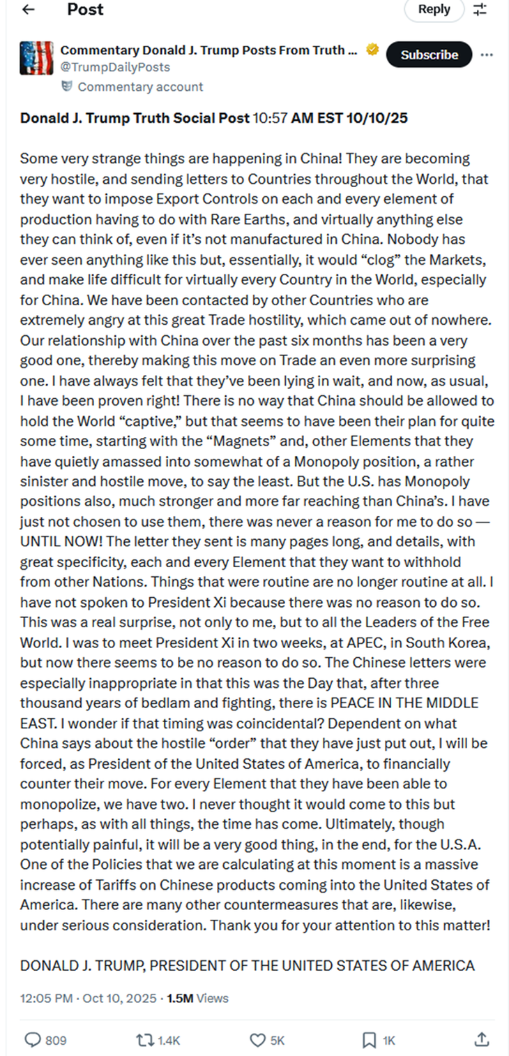 Se sumaron la necesidad de licencias especiales para las exportaciones de holmio, europio, yterbio, tulio y erbio (samario, gadolinio, disprosio, lutecio y escandio e itrio ya están restringidos), lo que en la práctica es casi una suspensión, a los que agregaron ciertas baterías de litio-ion, ánodos de grafito y diamantes sintéticos. Para que se entienda, si esto ocurriese, la industria norteamericana de alta tecnología -sumemos también la de Taiwán, Japón Alemania, etc.) enfrentaba la posibilidad de comenzar 2026 con las fábricas cerradas.