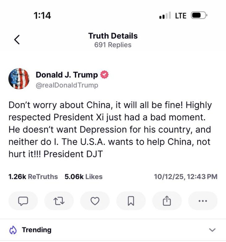 Pronto fue claro que esto solo no bastaba para calmar el enojo de los chinos, así que este domingo Trump fue un paso más adelante y sin pedir disculpas, pero haciéndolo, publicó en su red: “No se preocupen por China, ¡todo estará bien! El muy respetado presidente Xi acaba de tener un mal momento. No quiere una depresión para su país, y yo tampoco. ¡¡¡Los estados Unidos quieren ayudar a China, no lastimarla!!! Presidente DJT.