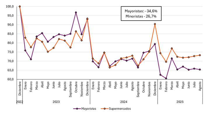 En agosto, las ventas de los autoservicios mayoristas se redujeron 8,4% interanual y mostraron un leve incremento mensual, inferior a 1%. En los supermercados, en cambio, se registró un aumento interanual de 0,34%, acompañado por una baja mensual de 0,23%.