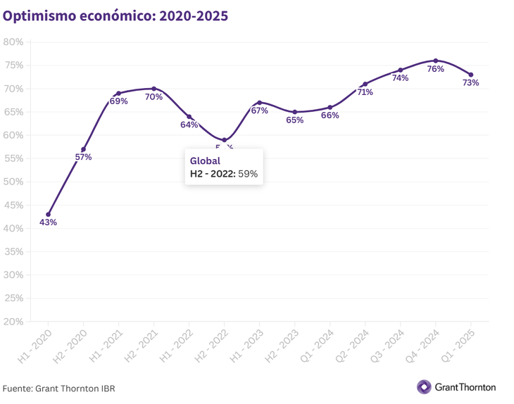 Según el estudio, por primera vez en dos años los líderes empresariales del mercado medio son menos optimistas sobre las perspectivas de su economía para los próximos 12 meses: el 73% expresa optimismo, pero ese porcentaje implica una caída de tres puntos porcentuales respecto del cuarto trimestre de 2024, cuando se ubicó en 76%.