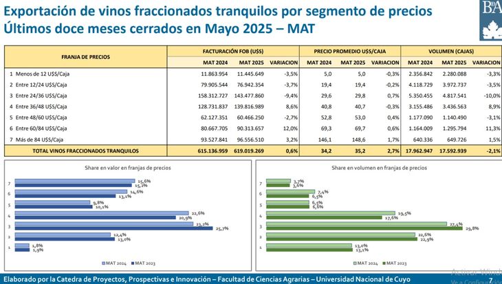 En el período que va desde mayo de 2024 hasta mayo de 2025, los volúmenes exportados de vinos fraccionados por segmento de precios muestran que en las categorías que oscilan entre 36/48 dólares por caja la variación es positiva (+8,9%). En cambio, en los segmentos de precio inferior a ese rango las variaciones son negativas.
