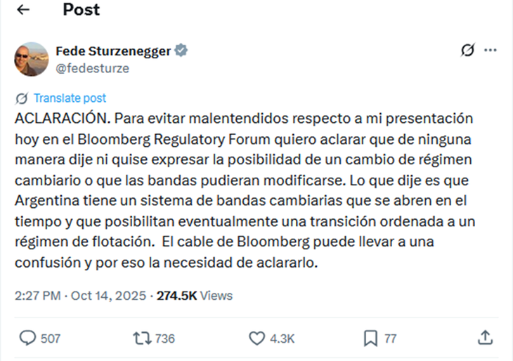 Más coincidente con el giro del mercado -o al menos de su profundización- fueron las declaraciones de Federico Sturzenegger en un foro organizado por Bloomberg deslizando que en no mucho tiempo se van a levantar las bandas cambiarias y el dólar va a flotar.
