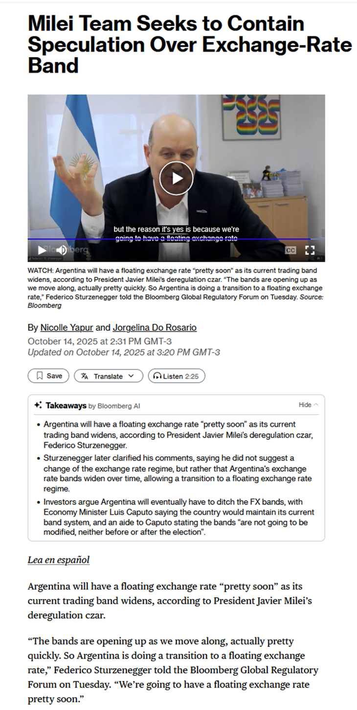 Para los que escuchamos de primera mano lo que dijo durante el almuerzo con Javier Milei la cosa fue clara: Donald Trump manifestó que su apoyo de mediano plazo a la argentinas dependía del resultado de las elecciones de medio término, el 26 de este mes (esto es congruente con la naturaleza de la operación de auxilio encarada, un swap, que es de corto plazo).